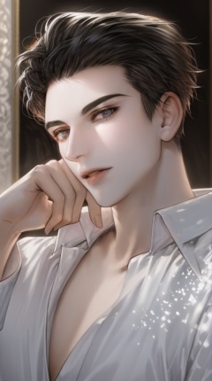 (best quality), ((masterpiece)), (highres), illustration, original, extremely detailed,  <lora:美の欲:0.7>1boy, male focus, solo, shirt, looking at viewer, white shirt, black hair, short hair, parted lips, upper body, collared shirt, hand on own face, long sleeves, grey eyes