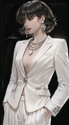 (best quality), ((masterpiece)), (highres), illustration, original, extremely detailed,  <lora:美の欲:0.7>1girl, jewelry, solo, black hair, earrings, short hair, jacket, necklace, long sleeves, hand in pocket, black background, bangs, cigarette, white jacket, signature, hand up, simple background, shirt