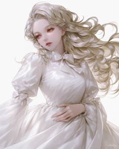 (best quality), ((masterpiece)), (highres), illustration, original, extremely detailed, <lora:美の欲:0.7>1girl, solo, long hair, dress, red eyes, white dress, white background, simple background, long sleeves, white theme, white hair, parted lips, bow, white bow, puffy sleeves, hand on own stomach, eyelashes, lips, floating hair, white bowtie, signature