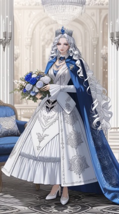 (best quality), ((masterpiece)), (highres), illustration, original, extremely detailed, <lora:美の欲:0.7>1girl, long hair, solo, holding, flower, bouquet, dress, holding bouquet, full body, blue cape, white flower, very long hair, standing, blue flower, cape, wavy hair, jewelry, looking at viewer, chandelier, white dress, white hair, white rose, long sleeves, rose, crown, blue rose, white footwear