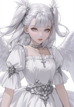 (best quality), ((masterpiece)), (highres), illustration, original, extremely detailed, <lora:美の欲:0.7>1girl, solo, jewelry, white hair, white theme, wings, long hair, grey eyes, cross, white background, earrings, looking at viewer, white dress, simple background, dress, parted lips, bangs, choker, ring, twintails, puffy sleeves, necklace, feathered wings, two side up, angel wings