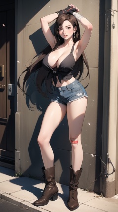 (best quality), ((masterpiece)), (highres), illustration, original, extremely detailed,1girl, solo, long hair, very long hair, breasts, bandaid, brown hair, fingerless gloves, bandages, shorts, tifa lockhart, gloves, brown eyes, large breasts, low-tied long hair, full body, boots, jewelry, arms up