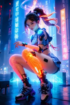 (masterpiece, best quality: 1.2) , 16K, horizontal image quality, technology of the future, 1girl, (side squat: 1.3) , glowing clothing, multi-line light on body, multi-light on body, glowing text on body,meatball head, (glowing electronic screen) , (electronic message flow: 1.3) , holographic projection, (glowing electronic screen on ARM: 1.2) , glowing text on thigh, (girl pose: 1.2) , glowing electronic shoes, body, colored smoke, city blocks, skyscrapers, neon signs, hand,A cyberpunk girl