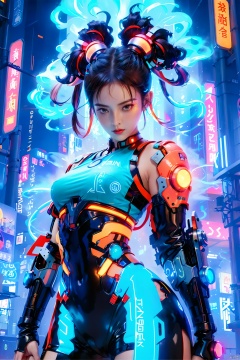 (masterpiece, best quality: 1.2) , 16K, 1girl, dynamic pose, glowing clothing, multi-line light on body, multi-light clothing, glowing text on body, Mech, Precision Mechanical Structure, double meatball head, glowing metal hair bands, mechanical collars, metal bracelets, (girl pose: 1.2) , colored smoke, city blocks, cyberpunk city background, glow, neon lights, night