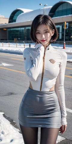 Outdoor scenery, snow view, Snow Mountain, girl, pretty face, short hair,  (photo reality: 1.3) , Edge lighting, (high detail skin: 1.2) , 8K Ultra HD, high quality, high resolution, the best ratio of four fingers and a thumb, (photo reality: 1.3) , white shirt inside,  solid color background,  advanced feeling, , 1 girl,   a girl, magic eyes, , 1girl, sd_mai, , tm, ((poakl flower style)), , blackpantyhose,print legwear, , ,, jiqing,short hair,bodysuit,mini_skirt