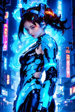 (masterpiece, best quality: 1.2) , 16K, 1girl, dynamic posture, VR, bioluminescent clothing, bioluminescent body, bioluminescent clothing, bioluminescent body text, armor, bioluminescent precision robotic arm, Mecha, (large area mech: 1.5) , glowing Metal headband, mechanical collar, metal bracelet, (Girl Pose: 1.2) , colored smoke, cyberpunk city background, glow, Neon, night, cyberpunk girl
