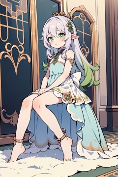 1girl, solo, nahida,blue queen dress,royalty,palace,crown,standing,full_body,serious expression,indoors,golden,(bare_feet),sitting on a throne,luxury dress,long dress,sad,hand on lap,puffy dress,delicate princess dress,noble,no shoes,lace_trim
