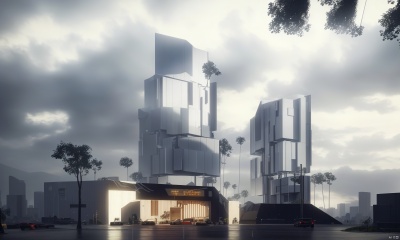 building ,Commercial,square,terrace,reflection,rainny,rain, humidity,((masterpiece)), (cyberpunk1.3),high las ((best quality:1.4)),(ultra-high resolution:1.2),(realistic:1.4),(8k:1.2),nsanely detailed,buildings,architecture,interior light,landscape, art artarchitecture,blue sky
