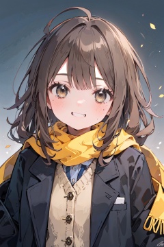 1girl, bangs, black_jacket, blazer, blush, brown_eyes, brown_hair, buttons, enpera, eyebrows_visible_through_hair, fringe_trim, grin, jacket, long_hair, long_sleeves, looking_at_viewer, open_clothes, open_jacket, scarf, school_uniform, signature, sleeves_past_wrists, smile, solo, sweater, teeth, upper_body