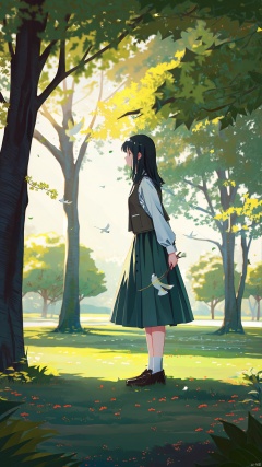 flat-style,1girl, bird, solo, outdoors, black hair, tree, skirt, long hair, vest, long sleeves