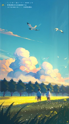 flat-style,sky, outdoors, scenery, cloud, grass, 1boy, day, blue sky, 1girl, very wide shot, bird