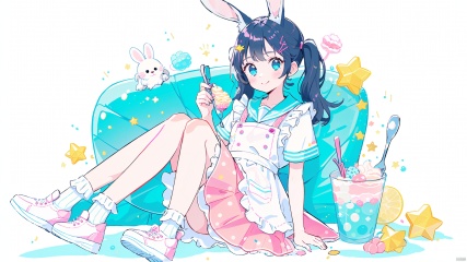 1girl, solo, animal ears, spoon, closed mouth, holding, pink sailor collar, holding spoon, white apron, rabbit ears, frilled apron, short sleeves, sailor collar, twintails, long hair, blush, apron, shoe soles, socks, blue eyes, food, smile, white socks, shoes, ice cream, bangs, frills, cup, hairclip, shirt, white shirt, sitting, hair ornament, black hair, white background, pink footwear, star \(symbol\), pink skirt, tail, bow, polka dot, looking at viewer, blue background, skirt, holding food