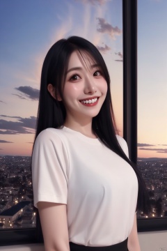 1girl solo solo long hair smile black hair sky teeth grin black eyes lips window sunset realistic,, shirt_lift,