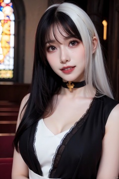 cinematic lighting, ((best quality)),((single_human_girl)),((((upper_body)))),((extremely_detailed_eyes_and_face)),((church)),((annoyed)),((ink)),((illustration)),depth of field,((frown)),((expression)),((red_eyes)),((((white_hair)))),((extremely detailed)),((watercolor)),((anime face)),(skull_on_dress),(((yokozuwari))),((detailed_skeleton_church)),(((beautiful_detailed_black_gothic_Empire_Waist_Dress))),(((dramatic_angle))),medium_breast,(8k_wallpaper),((bright_eyes)), (looking_at_viewers),((close_to_viewers)),((masterpiece)),(((((messy_long_hair))))),((((1girl)))),lens_flare,light_leaks1girl solo solo long hair smile black hair sky teeth grin black eyes lips window sunset realistic