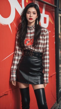 sdmai, pop art, 1girl, solo, skirt, shirt, thighhighs, black hair, realistic, jewelry, looking at viewer, long hair, long sleeves, standing, earrings, black skirt, print shirt, plaid, red lips, plaid shirt, black thighhighs <lora:SDMAI波普艺术风格摄影pop art:0.8>