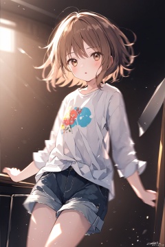 1girl, blurry, blurry_background, blurry_foreground, brown_eyes, brown_hair, dated, depth_of_field, looking_at_viewer, motion_blur, shirt, short_hair, shorts, signature, sleeves_rolled_up, solo, tomboy, twitter_username, white_shirt