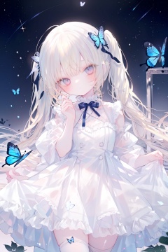 1girl, loli, long hair, dress, white pantyhose, white frilled, blonde hair, heteromonic, dynamic angle, gothic delusion,
