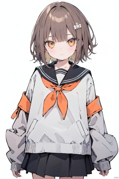 solo, 1girl, sleeves past wrists, school uniform, sleeves past fingers, skirt, simple background, bangs, hair ornament, serafuku, white background, short hair, parted lips, pleated skirt, long sleeves, muted color, neckerchief, brown hair, sailor collar, black skirt, blunt bangs, cowboy shot, orange eyes, black sailor collar, looking at viewer