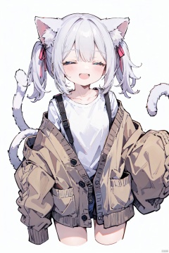1girl, solo,catgirl,cat ears,cat tail,white hair, twintails, blush, smile, shirt, white shirt, long shirt, ^ ^, brown cardigan, cardigan, closed eyes, collarbone, cropped legs, long sleeves, sleeves past fingers, sleeves past wrists, upper teeth only, teeth, white background