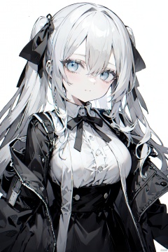 1girl, adjusting_gloves, bangs, blush, breasts, dress, eyebrows_visible_through_hair, gloves, greyscale, hair_between_eyes, hair_ribbon, jacket, long_hair, long_sleeves, looking_at_viewer, medium_breasts, parted_lips, ribbon, sidelocks, simple_background, very_long_hair, white_background, white_gloves