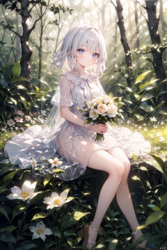 masterpiece,best quality,, 1girl, sitting on grass, flowers, holding flowers, warm lighting, white dress, blurry foreground, (forest:1.5)