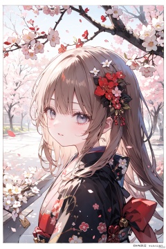 1girl, artist_name, bangs, blunt_bangs, border, branch, brown_hair, cherry_blossoms, flower, from_side, hair_flower, hair_ornament, japanese_clothes, kimono, long_hair, looking_at_viewer, looking_to_the_side, parted_lips, petals, red_kimono, solo, upper_body, white_border