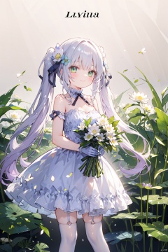 1girl, bangs, bare_shoulders, blue_dress, bouquet, breasts, character_name, cleavage, closed_mouth, daisy, dress, eyebrows_visible_through_hair, floral_background, flower, gloves, green_eyes, hair_ornament, hk416_\(girls'_frontline\), holding_bouquet, holding_flower, lily_\(flower\), lily_of_the_valley, lily_pad, long_hair, looking_at_viewer, lotus, low_twintails, mole, multi-tied_hair, ribbon, smile, solo, strapless_dress, thighhighs, vase, very_long_hair, white_flower, white_rose