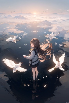 1girl, brown hair, long hair, closed eyes, (above ground), (water surface, reflection, surrounded by white birds), ((from above)), blurry, (full body, wide shot, panorama), (grey background), (shining, fog)