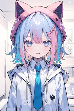 solo, looking at viewer, blush, short hair, open mouth, shirt, hair ornament, long sleeves, animal ears, blue hair, white shirt, pink hair, male focus, multicolored hair, necktie, hairclip, hood, hood down, pale skin, party hat