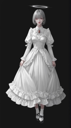 (best quality), ((masterpiece)), (highres), illustration, original, extremely detailed,  <lora:ACG ART_V:0.7>halo, spot color, solo, red eyes, jewelry, 1girl, long sleeves, monochrome, short hair, bangs, puffy long sleeves, frills, looking at viewer, arm at side, hand up, black background, holding, bow, liquid, full body, puffy sleeves, red gemstone, light particles, socks, brooch, dress, shoes, greyscale, gem, parted lips, standing, sleeves past wrists, earrings, ribbon