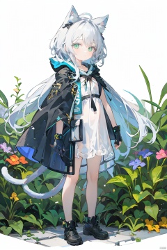 rosmontis, 1girl, animal ears, green eyes, long hair, cat ears, gloves, fingerless gloves, dress, looking at viewer, holding, black gloves, earpiece, grey hair, cat girl, cat tail, white dress, tail, animal ear fluff, bangs, hood down, closed mouth, hood, cloak, open clothes, Expressionless, portrait,full body, standing, garden, Thick coating