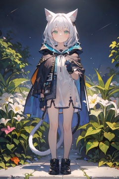 rosmontis, 1girl, animal ears, green eyes, long hair, cat ears, gloves, fingerless gloves, dress, looking at viewer, holding, black gloves, earpiece, grey hair, cat girl, cat tail, white dress, tail, animal ear fluff, bangs, hood down, closed mouth, hood, cloak, open clothes, Expressionless, portrait,full body, standing, garden, Thick coating,night sky