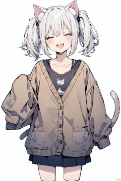 1girl, solo,catgirl,cat ears,cat tail,white hair, twintails, blush, smile, shirt, white shirt, long shirt, ^ ^, brown cardigan, cardigan, closed eyes, collarbone, cropped legs, long sleeves, sleeves past fingers, sleeves past wrists, upper teeth only, teeth, white background