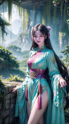 (Masterpiece, best quality: 1.5), surreal, 1 girl, long hair, straight hair, portrait, mysterious forest, sweet smiling girl, exquisitely decorated cheongsam, medium chest, exquisite and realistic details, magical tower background, mysterious fantasy world, colorful and colorful