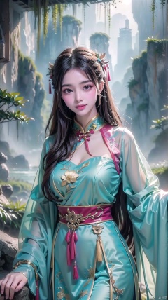 (Masterpiece, best quality: 1.5), surreal, 1 girl, long hair, straight hair, portrait, mysterious forest, sweet smiling girl, exquisitely decorated cheongsam, medium chest, exquisite and realistic details, magical tower background, mysterious fantasy world, colorful and colorful, gufengsw001