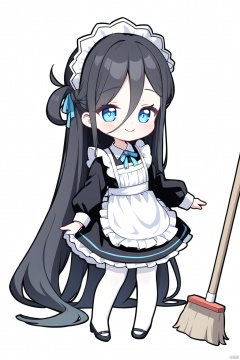 long hair,smile,blue eyes,black hair,very long hair,full body,pantyhose,alternate costume,apron,maid,maid headdress,alternate hairstyle,maid apron,broom,white pantyhose,absurdly long hair,aris \(blue archive\),aliceMaid