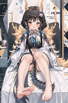 1girl, arm behind back, 1girl, ((black hair)), ((dragon girl)), ((dragon)), ((dragon horns)), ((yellow horns)), ((dragon tail)), ((furry tail)), ((yellow furry)), ((black dragon)), ((bow on tail)), ((hair ornament)), ((seashell headpiece)), ((hairpin)), ((swimsuit)), ((ribbon)), ((ribbon swimsuit)), ((coat)), ((thigh strap)), ((sandals)), ((black and white swimsuit)), ((golden eyes)), ((suspenders)), ((belt collar)), ((big eyes)), ((feet)), ((foot)), ((Sumi)), ((bedroom)), ((laying)), ((sleeping)), ((bed)), ((on the bed)), ((feet)), ((foot))