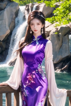 1 girl (Eyes\(dark amber, crystal clear, long eyelashes\), nose\(raised, nose tip slightly upturned), lips (Rose color, lip line clear), hairstyle Black hair, smooth and shiny, hair accessories, slightly wavy hair tips, cloth (Chinese dress,Wide sleeved,long sleeved,sleeves extending outside fingers)),(Standing on the hill, hands hanging at sides): 1.5,Background\(Waterfall): 1.5, Sky, Stone Bridge\) Ultra fine, extremely delicate and beautiful (by fine color blocks), Masterpiece, Best quality, Unreal Engine 5 rendering, Cinemight, Cinematography Lens, Cinematography Effects, Detailed details, sdmai, light