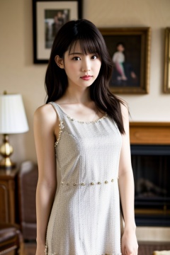 1girl, Embellished shift dress with fringe details, living room,upper body,HWGIRL,<lora:Hwgirl_V07:0.9>,