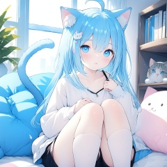 (masterpiece), (best quality), illustration, ultra detailed, hdr, Depth of field, (colorful),1girl, solo, cat ears, looking at viewer, animal ears, blue eyes, indoors, socks, blue hair, white socks, sitting, long hair, cat tail, cat girl, stuffed toy, shorts, tail, bangs, blush, knees up, on bed, white shirt, stuffed animal, long sleeves, parted lips, bookshelf, animal ear fluff, window, shirt, ahoge, collarbone, feet out of frame, short shorts, hair ornament, kneehighs, book, black shorts, hair between eyes