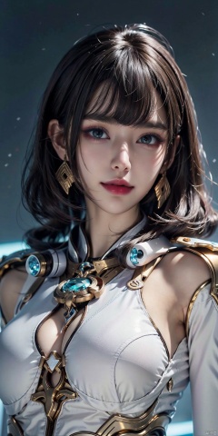 cowboy_shot ,1girl,Bangs, off shoulder, colorful_hair, ((colorful hair)), purple eyes, , necklace, earrings, floating hair, jewelry, sleeveless, very long hair,looking_at_viewer, parted lips, pierced,energy,electricity,magic,sssr,,, (gold armor), , , (\shuang hua\), ((poakl)),short hair,kind smile ,looking_at_viewer, jiqing