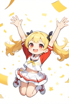 chibi,yellow hair,red eyes,twintails,white cheer girl's uniform,black ribbon,bangs,solo welcome pose,happy,celebrate,stretching hands,raise hands,say hello,(((jump up))),dynamic angle,white background,, (masterpiece,best quality:1.2)