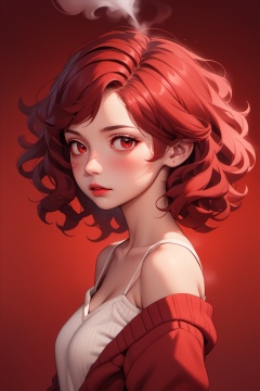 bare shoulder,1 girl,portrait,curly hair,simple background,lips,spark,camisole,Pullover Sweater,realistic,in the villa,steamy,steam,sad,deep red gradient background,, (masterpiece,best quality:1.2)