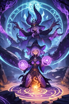 Witches in an intricate magic circle,kneeling,casting spells,glowing tentacles,magic rune tattoos,caves,dungeons,spells,fantasy art,amazing gradient colors,, (masterpiece,best quality:1.2)