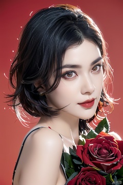 Main clip, Close up portrait, Close up, 1 girl, red background,((black hair)),((smooth hair)),(front face), dress made with red roses, emotional face, Close up, studio light, studio,(makeup portrait, black eyes, red eye shadow)),((many red roses covering her face)), jy, 1girl, MAJICMIX STYLE, light, white dress