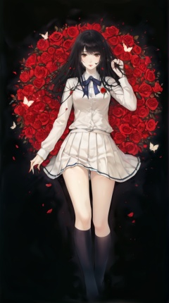 (best quality), ((masterpiece)), (highres), illustration, original, extremely detailed,   <lora:黑暗物语葬の花:0.7>1girl, solo, flower, black hair, rose, school uniform, long hair, bug, butterfly, skirt, brown eyes, blood, red flower, kneehighs, red rose, socks