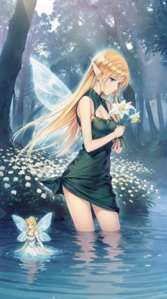 (best quality), ((masterpiece)), (highres), illustration, original, extremely detailed,   <lora:黑暗物语葬の花:0.7>pointy ears, blonde hair, flower, long hair, fairy, wading, holding flower, wings, elf, multiple girls, water, blue eyes, dress, tree, nature, fairy wings, 3girls, circlet, holding