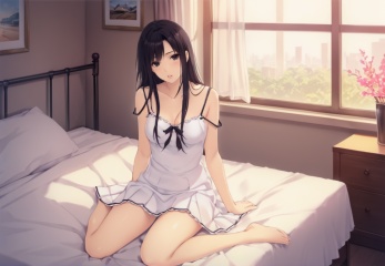 (best quality), ((masterpiece)), (highres), illustration, original, extremely detailed,   <lora:黑暗物语葬の花:0.7>1girl, solo, long hair, black hair, strap slip, skirt, arm support, school uniform, parted lips, bed, on bed, black eyes, sitting, breasts, window, collarbone, looking at viewer, chemise, indoors, medium breasts, pleated skirt, serafuku, dress, bare shoulders, white dress, black serafuku, underwear, spaghetti strap, camisole