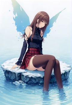 (best quality), ((masterpiece)), (highres), illustration, original, extremely detailed,   <lora:黑暗物语葬の花:0.7>solo, 1girl, thighhighs, skirt, brown hair, long hair, sitting, water, soaking feet, torn clothes, detached sleeves, wings