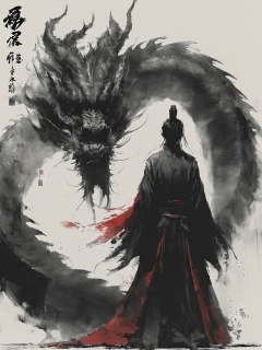 ananmo, dragon, sharp teeth, eastern dragon, 1boy, single hair bun, teeth, standing, monster, solo, horns, male focus, hair bun, monochrome, robe, from behind, size difference, open mouth, claws, spot color